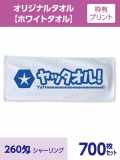 オリジナルタオル [ホワイトタオル] 枠有プリント 外国製 (260匁シャーリング加工)700枚セットは、綿100%260匁外国製、使い勝手の良いフェイスタオルです。 タオルの表面は、パイルをカットした「シャーリング加工」柔らかい肌触りが特長で、目が細かいためプリントタオルが大変キレイに作成できます。裏面はパイル地のままなので吸水性が非常に良いです。 印刷は、ほぼ全面に印刷できるコストパフォーマンスの高い「枠有プリント」で、印刷方法はポピュラーな「スクリーン印刷」。版をつくり1色インクでプリントします。当店では小ロット100枚から対応いたします。